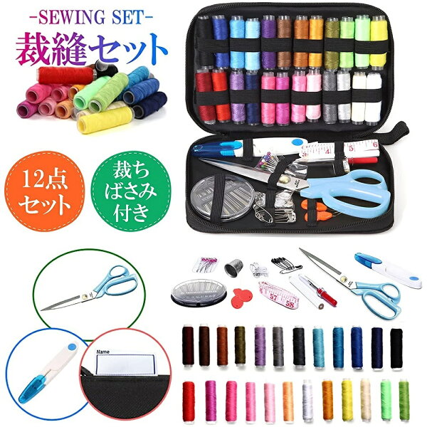 商品情報セット内容・収納バック(ネームタグ付き)・1個裁ちばさみ:1本・糸切はさみ:1本・縫い針:30本・まち針:10本・カラー縫い糸:24色(各1本)・糸通し:2個・リッパー:1本・メジャー:1個・色鉛筆(白):1本・指抜き:1個・安全ピン:5本・予備品(糸通し・安全ピン(ボタン):1セット裁縫セット ソーイングセット コンパクト 裁縫道具 裁縫 セット シンプル 裁縫道具セット お裁縫セット 小学生 大人 大人向け たちばさみ 裁ちばさみ 裁縫ハサミ 糸切りばさみ 縫い針セット ネームタグ付き 50点セット 裁ちばさみ、糸切ばさみ、ネームタグ付きバック、その他の裁縫道具と合わせ計12点のソーイングセットです。