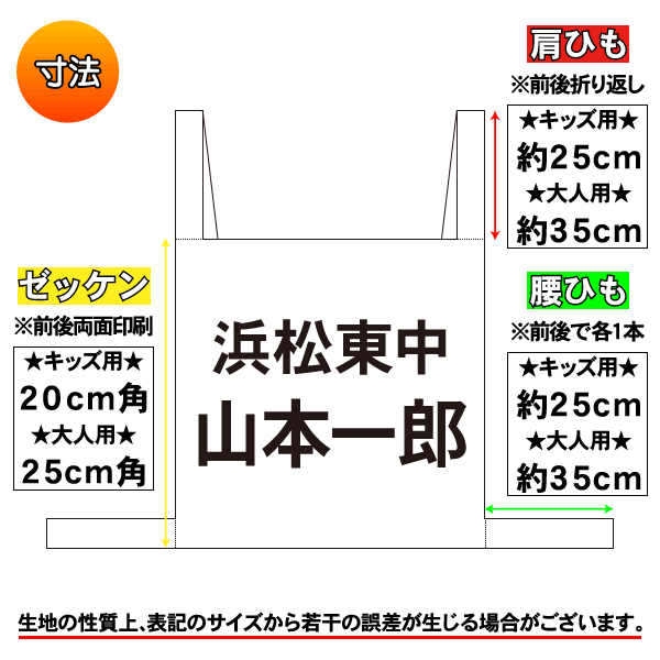 サイズ: 大人用 生地W25cm×H25cm(サイド紐約35センチ×4本) 子ども用 生地W20cm×H20cm(サイド紐約25センチ×4本) 材質:ポリエステル ゼッケン2枚が肩紐(肩ひも)と腰紐(腰ひも)で繋がった両面印刷タイプのゼッケンです。